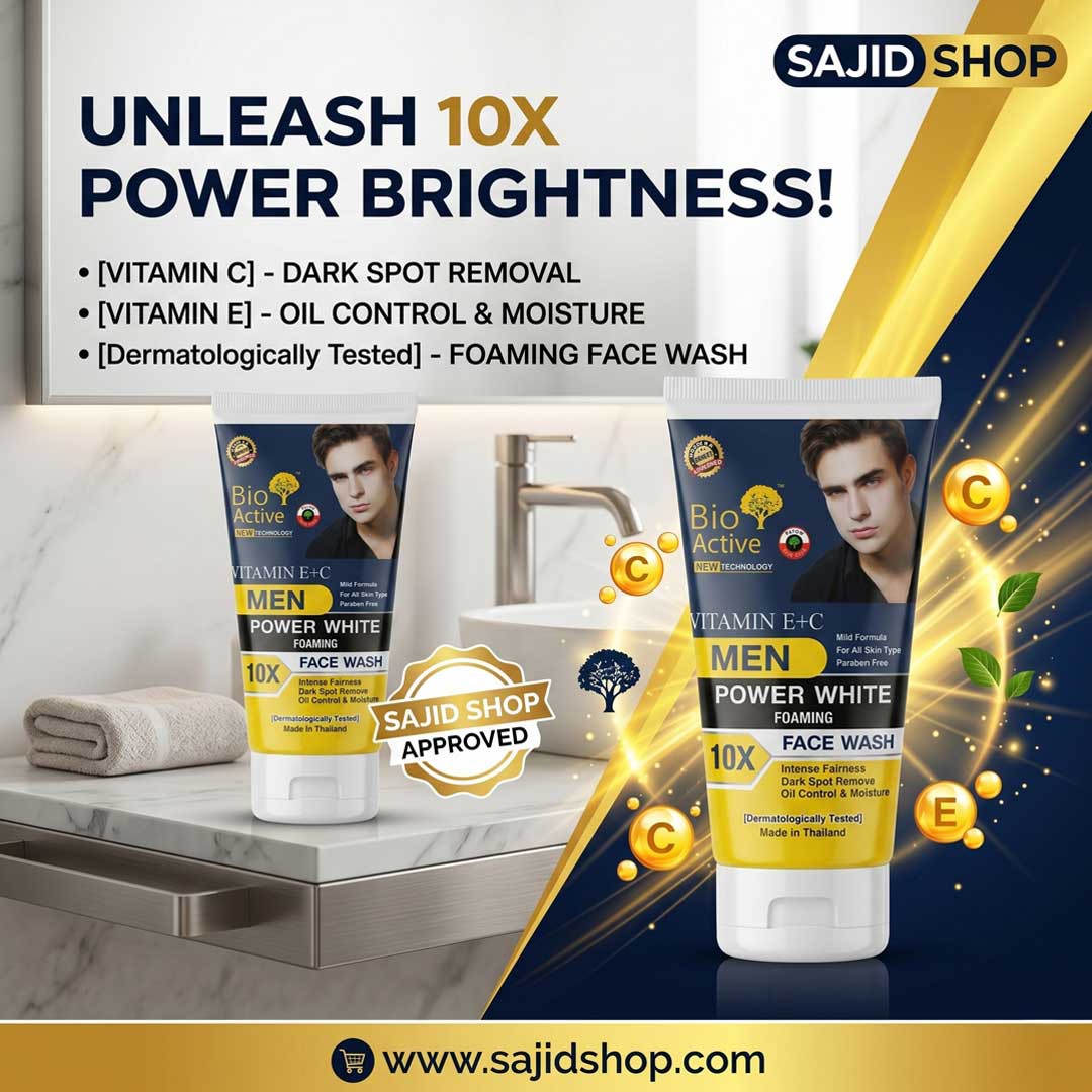 Bio Active Vitamin E+C Men Power White Foaming Face Wash একটি মাল্টি-অ্যাকশন ক্লিনজার, যা স্কিনকে গভীরভাবে পরিষ্কার করার পাশাপাশি ব্রাইট ও ফ্রেশ লুক দিতে সাহায্য করে। Vitamin E ও Vitamin C সমৃদ্ধ ফর্মুলা ত্বকের ডালনেস কমিয়ে হেলদি গ্লো আনে। (FDA)