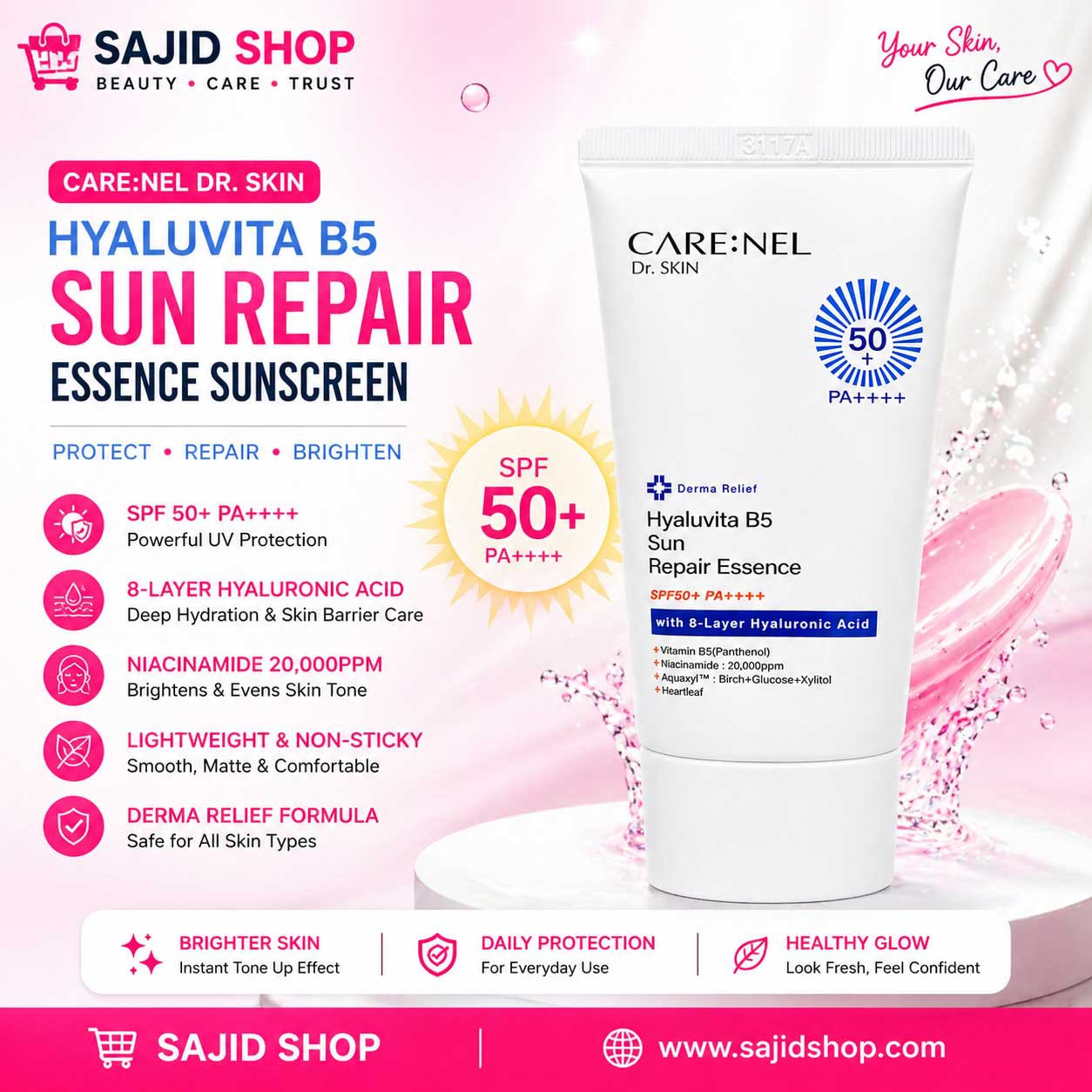 ডেইলি সান প্রোটেকশনের সাথে ডিপ হাইড্রেশন ও স্কিন রিপেয়ার একসাথে পেতে চাইলে Care:nel Hyaluvita B5 Sun Repair Essence SPF50+ PA++++ একটি স্মার্ট চয়েস। এটি একটি লাইটওয়েট সানস্ক্রিন এসেন্স, যা ত্বকে সহজেই অ্যাবজর্ব হয় এবং কোনো হেভি বা স্টিকি ফিল দেয় না। (JHA)