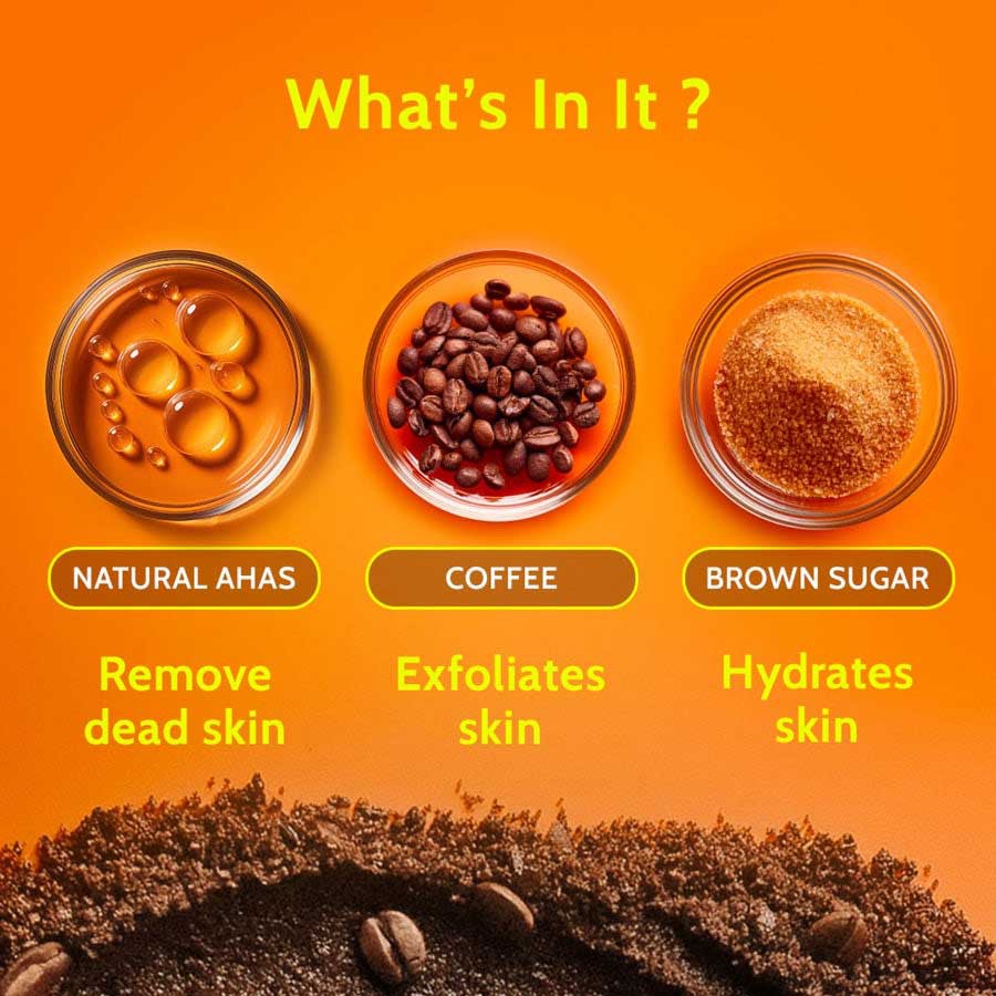 এতে থাকা Coffee ত্বকের ডালনেস কমাতে ও স্কিনকে এনার্জাইজ করতে সাহায্য করে। পাশাপাশি Brown Sugar একটি ন্যাচারাল এক্সফোলিয়েন্ট হিসেবে কাজ করে, যা ত্বকের উপরের জমে থাকা ডেড স্কিন আলতোভাবে রিমুভ করে স্কিন টেক্সচার উন্নত করে। এতে থাকা Natural AHAs এক্সফোলিয়েশন প্রক্রিয়াকে আরও কার্যকর করে তোলে।