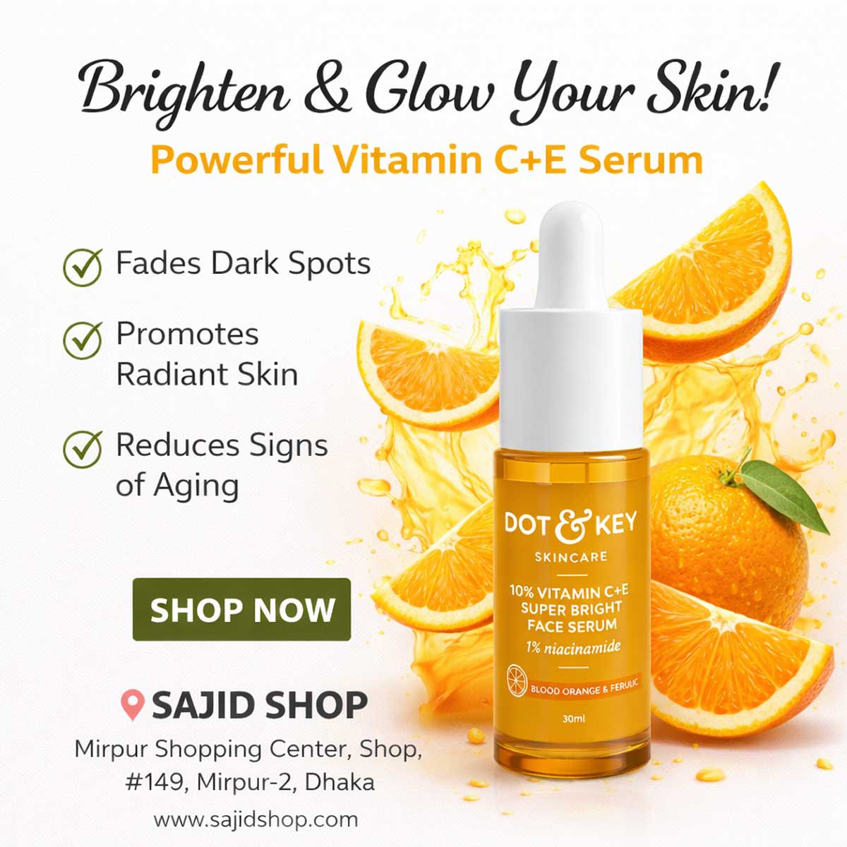 Dot & Key 10% Vitamin C + E Super Bright Face Serum হলো একটি পাওয়ারফুল ব্রাইটেনিং সিরাম, যা স্কিনকে ডালনেস থেকে মুক্ত করে এনে দেয় ন্যাচারাল গ্লো। ভিটামিন C এবং E এর শক্তিশালী কম্বিনেশন স্কিনকে করে তোলে উজ্জ্বল, স্মুথ এবং হেলদি। (JGA)