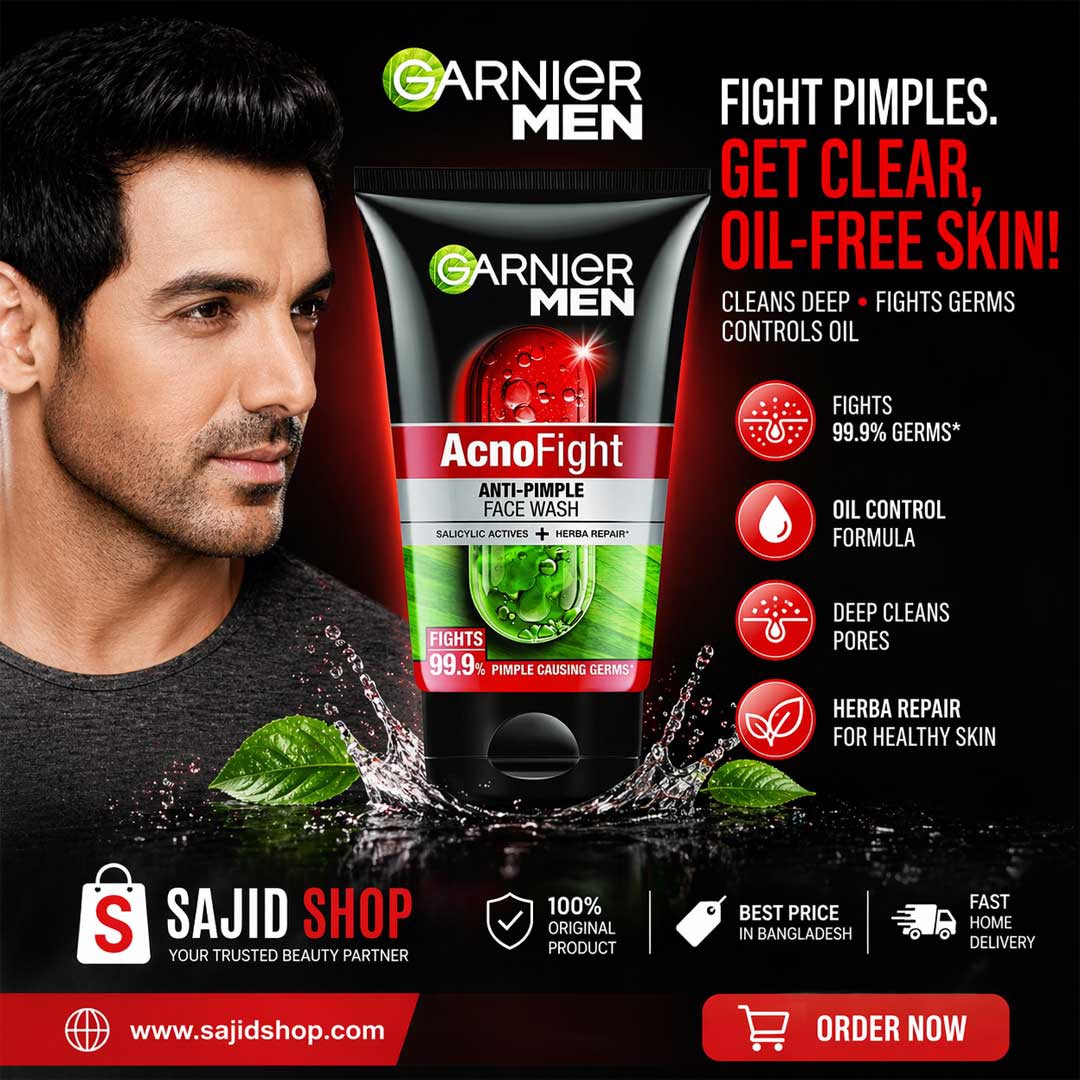 Garnier Men Acno Fight Anti-Pimple Face Wash হলো পুরুষদের জন্য বিশেষভাবে তৈরি একটি ডিপ ক্লিনজিং ফেসওয়াশ, যা ব্রণ, অতিরিক্ত তেল এবং পোরে জমে থাকা ময়লা দূর করতে কার্যকরভাবে কাজ করে। এতে থাকা Salicylic Actives স্কিনের ভেতর পর্যন্ত গিয়ে পিম্পল-কজিং জার্মস কমাতে সাহায্য করে, ফলে স্কিন থাকে ক্লিন, ফ্রেশ এবং অয়েল-ফ্রি। (EIG)