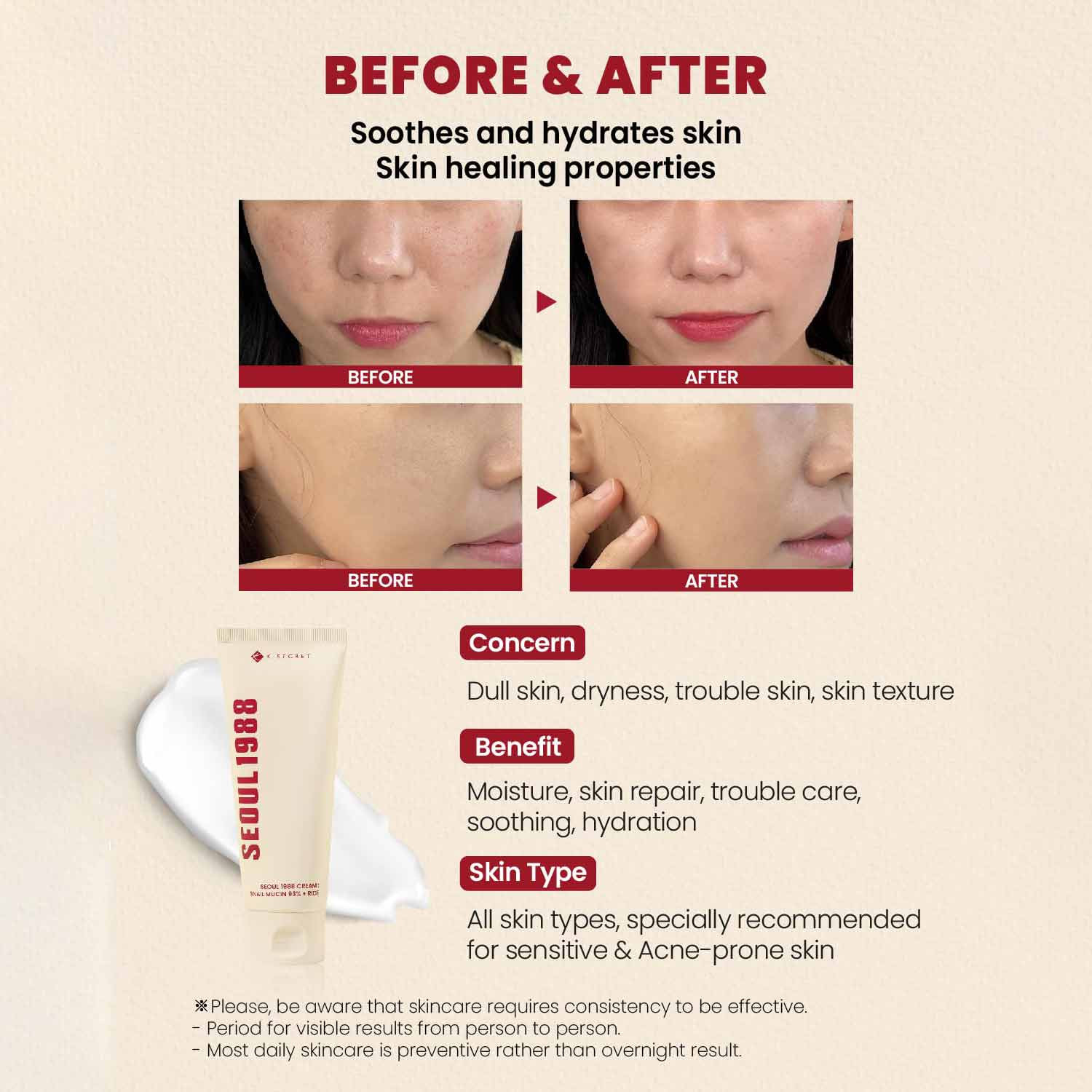 Discover the power of K-beauty with K-SECRET Seoul 1988 Cream, enriched with 93% Snail Mucin and Rice Extract. This ultra-hydrating cream helps repair damaged skin, reduce acne scars, and brighten dull complexion — all while keeping your skin smooth, firm, and glowing.