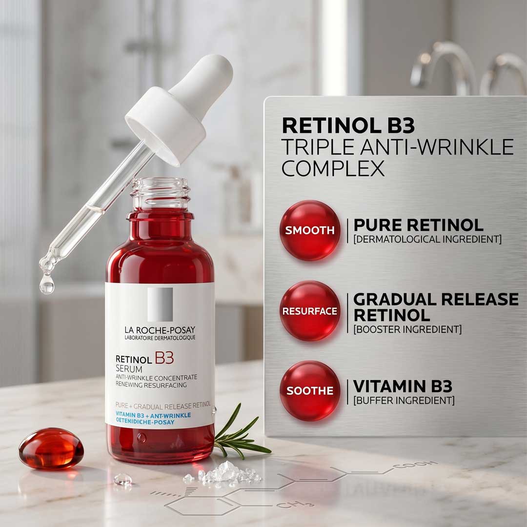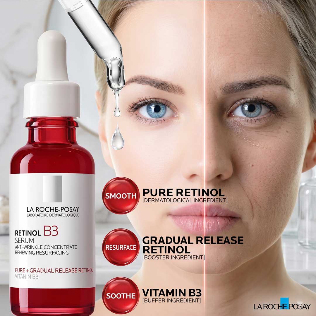 স্কিনে ফাইন লাইন, রিঙ্কল বা রাফ টেক্সচার দেখা দিলে সঠিক রেটিনল কেয়ার খুবই জরুরি। La Roche-Posay Retinol B3 Serum একটি ডার্মাটোলজিস্ট-রেকমেন্ডেড অ্যান্টি-এজিং সল্যুশন, যা স্কিনকে ধীরে ধীরে স্মুথ, ফার্ম এবং ইয়াং দেখাতে সাহায্য করে।