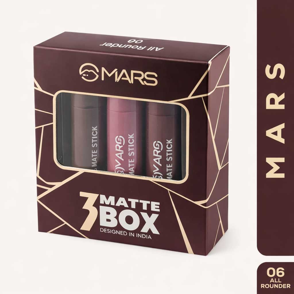 MARS 3 Matte Box Lipsticks Set (All Rounder – 06) হচ্ছে এমন একটি পারফেক্ট লিপস্টিক কম্বো, যেখানে আপনি পাবেন ৩টি ট্রেন্ডি ও wearable matte শেড। ডেইলি ব্যবহার থেকে শুরু করে পার্টি বা অফিস লুক—সবকিছুর জন্যই এই সেটটি খুবই উপযোগী। সফট ম্যাট টেক্সচার হওয়ায় লিপস্টিক সহজে স্মুথলি গ্লাইড করে এবং দীর্ঘ সময় আরামদায়ক ফিল দেয়। (GGA)