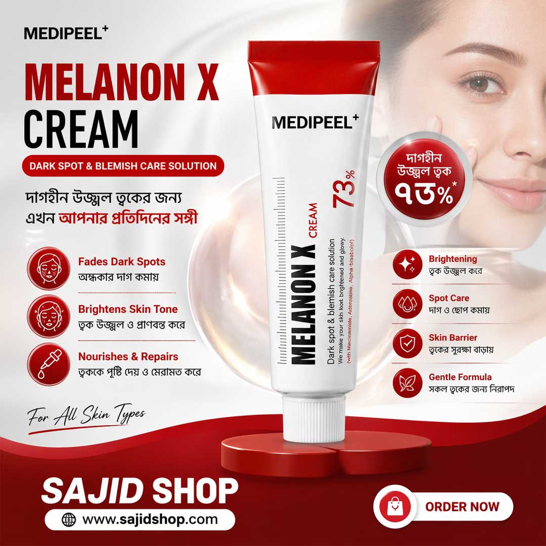 MEDIPEEL Melanon X Cream 73% হলো একটি অ্যাডভান্সড কোরিয়ান স্কিনকেয়ার সলিউশন, যা ডার্ক স্পট, পিগমেন্টেশন, মেছতা ও ব্রণের দাগ কমাতে কার্যকরভাবে কাজ করে। উচ্চমাত্রার ব্রাইটেনিং কমপ্লেক্স স্কিনকে ধীরে ধীরে ক্লিয়ার, ইভেন ও রেডিয়েন্ট করে তোলে—যা বাংলাদেশি আবহাওয়ায় স্কিন কেয়ারের জন্য বেশ উপযোগী। (CAAA)
