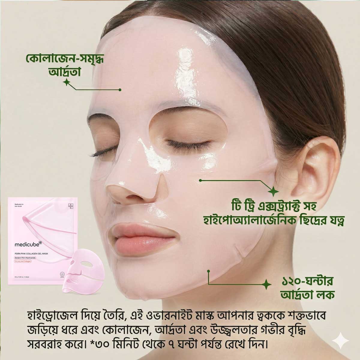 ত্বককে instantly hydrated, plump এবং radiant করতে চাইলে Medicube PDRN Pink Collagen Gel Mask একটি পারফেক্ট চয়েস। এই প্রিমিয়াম কোরিয়ান জেল মাস্কটি Sodium DNA (PDRN), Niacinamide এবং Hydrolyzed Collagen দিয়ে ফর্মুলেটেড, যা স্কিনকে ভিতর থেকে nourish করে এবং elasticity improve করতে সাহায্য করে। (FGA)