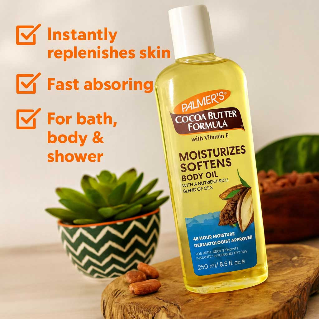 Palmer’s Cocoa Butter Body Oil is trusted worldwide for its authentic formula that instantly replenishes moisture, relieves roughness, and restores the natural glow of your skin. Whether you want a quick post-shower hydration or a luxurious self-care treatment, this oil absorbs quickly and locks in long-lasting softness.