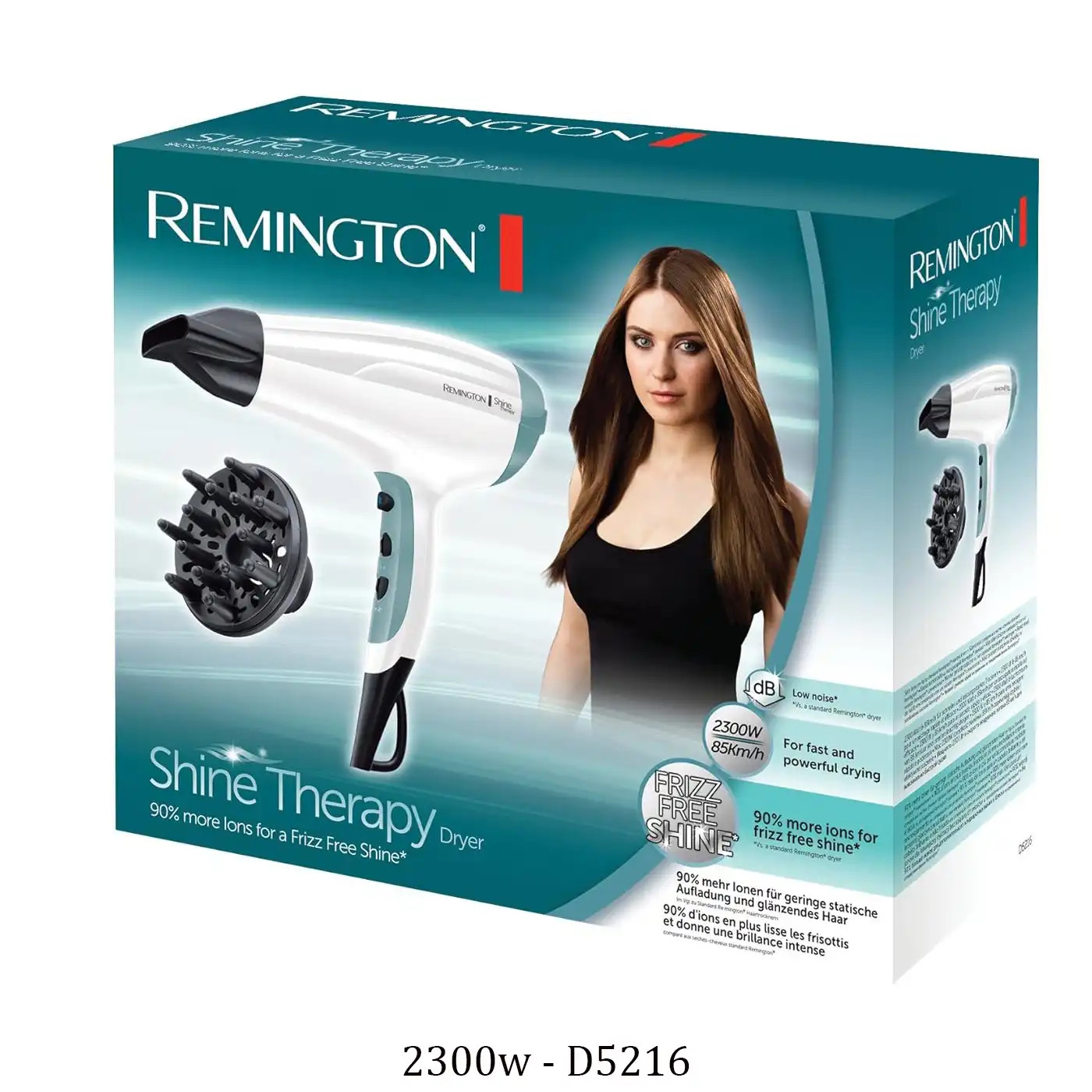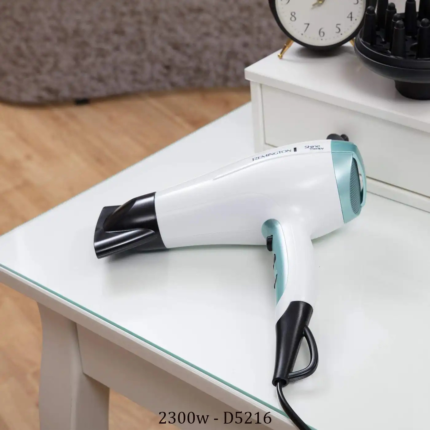 The Remington Shine Therapy Hair Dryer (model D5216) is designed to deliver a glossy, frizz-free finish with each use, thanks to its advanced ionic technology. Equipped with a powerful 2300W motor, it offers an airflow speed of 85 km/h for quick and efficient drying.