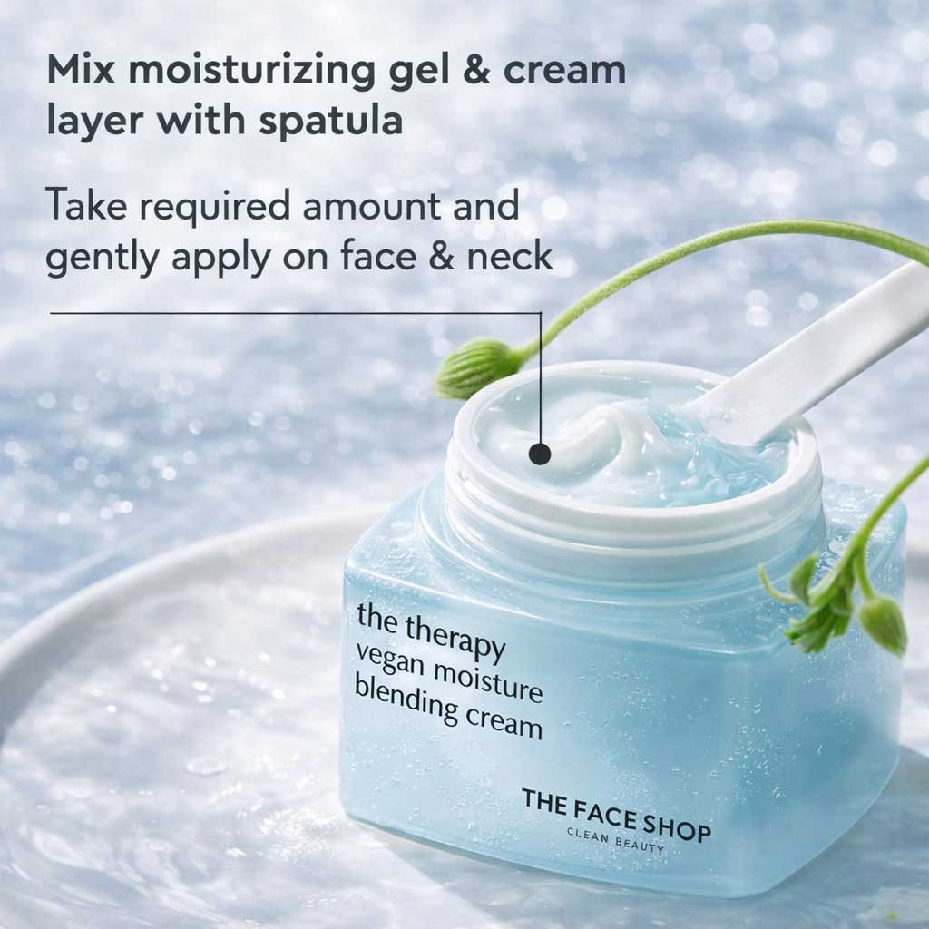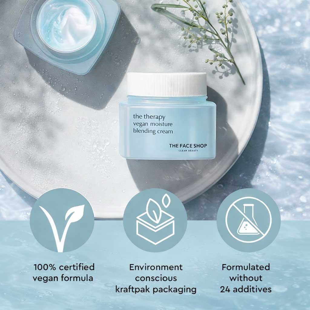 THE FACE SHOP The Therapy Vegan Moisture Blending Cream তৈরি করা হয়েছে স্কিন-ফ্রেন্ডলি ভেগান উপাদান দিয়ে, যা ত্বকে গভীরভাবে হাইড্রেশন দেয় ও ময়েশ্চার ব্যারিয়ার শক্তিশালী করতে সাহায্য করে।